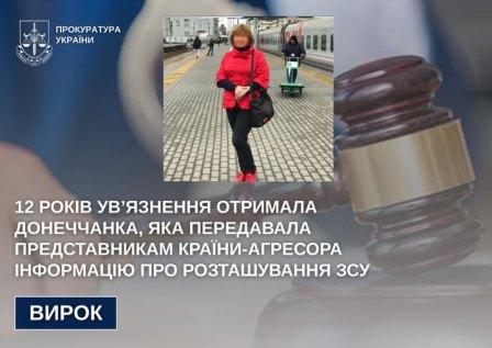 За публічного обвинувачення прокурорів Черкаської обласної прокуратури заочно засуджено мешканку Донецької області, яка поширювала інформацію про розміщення Збройних Сил України. Їй призначено покарання – 12 років позбавлення волі.