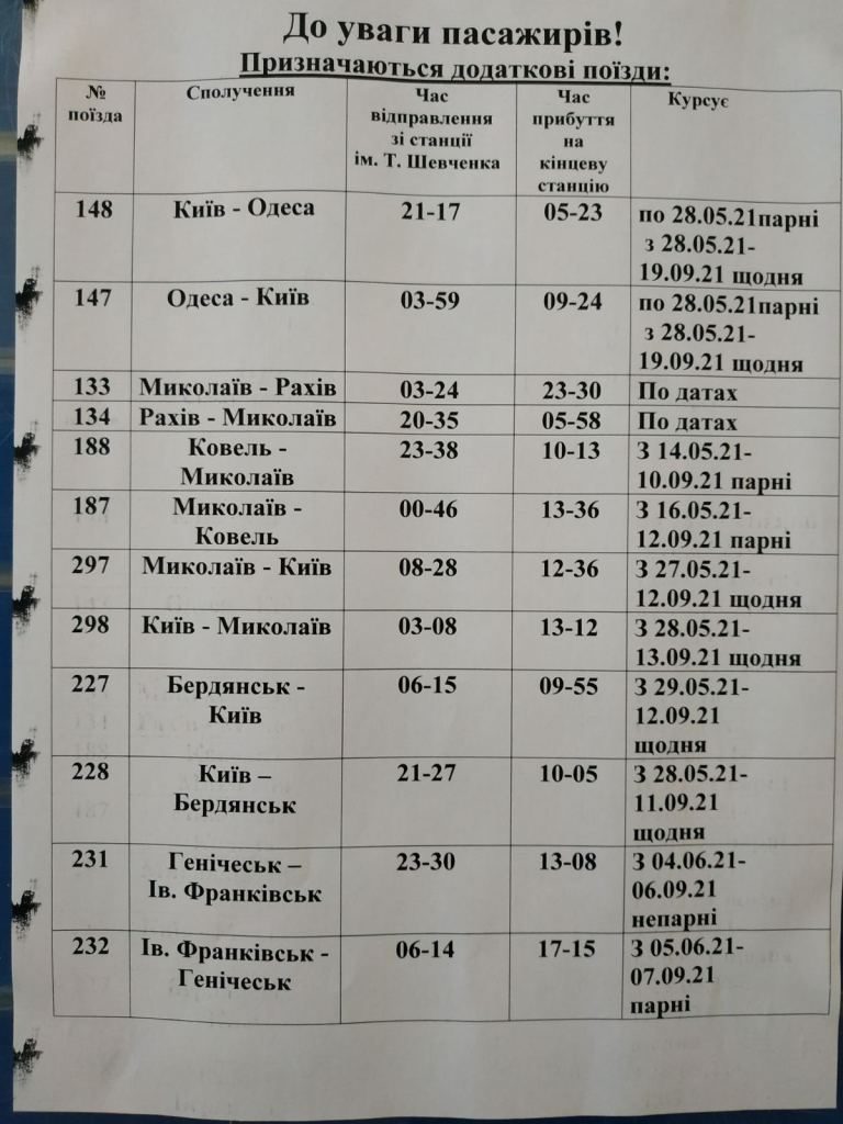 Поїзди сполученням Ковель – Миколаїв – лише по парним датам.