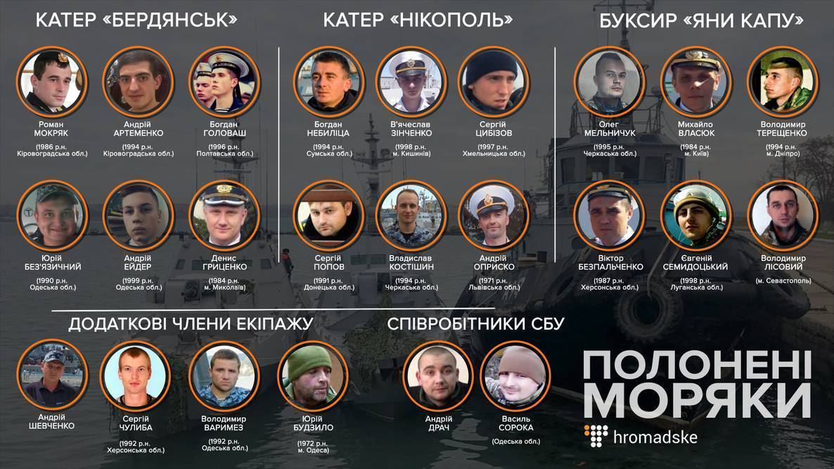 25 листопада українські кораблі та рейдовий буксир при виході з Керченської протоки були обстріляни. Усі були взяті у полон. Їх звинуватили у незаконному перетині кордону Російської Федерації в Чорному морі.