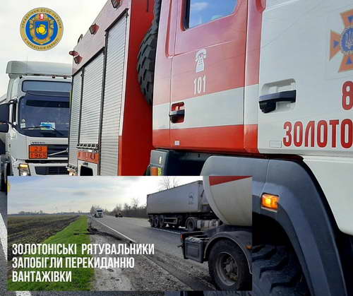 З’ясувалося, що водій транспортного засобу після зупинки біля села Піщане Золотоніського району на автодорозі Бориспіль-Запоріжжя не може виїхати з узбіччя та продовжити рух. Під багатотонним причепом просів ґрунт. Автомобіль міг перекинутися разом із причепом, в якому була небезпечна суміш.