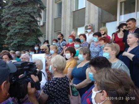 img_20200623_102329_1Перед приміщенням Будинку рад відбувся мітинг з вимогою виплати заробітної плати медичним працівникам. Як раніше повідомлялося, сесія міської ради не відбувається за відсутністю кворуму, а саме через неявку депутатів.